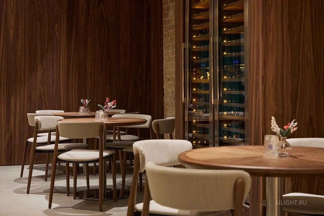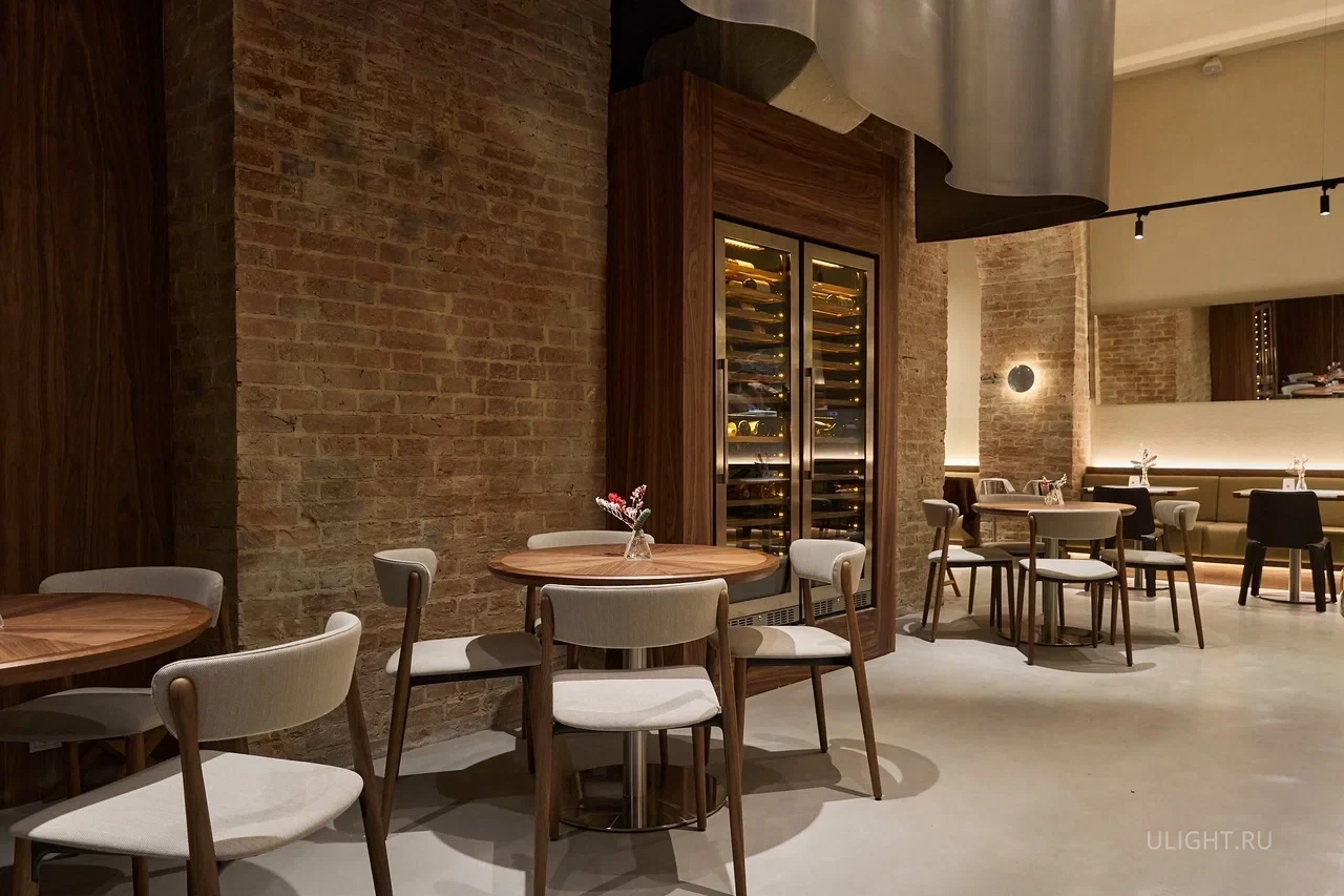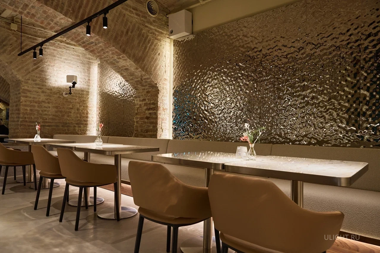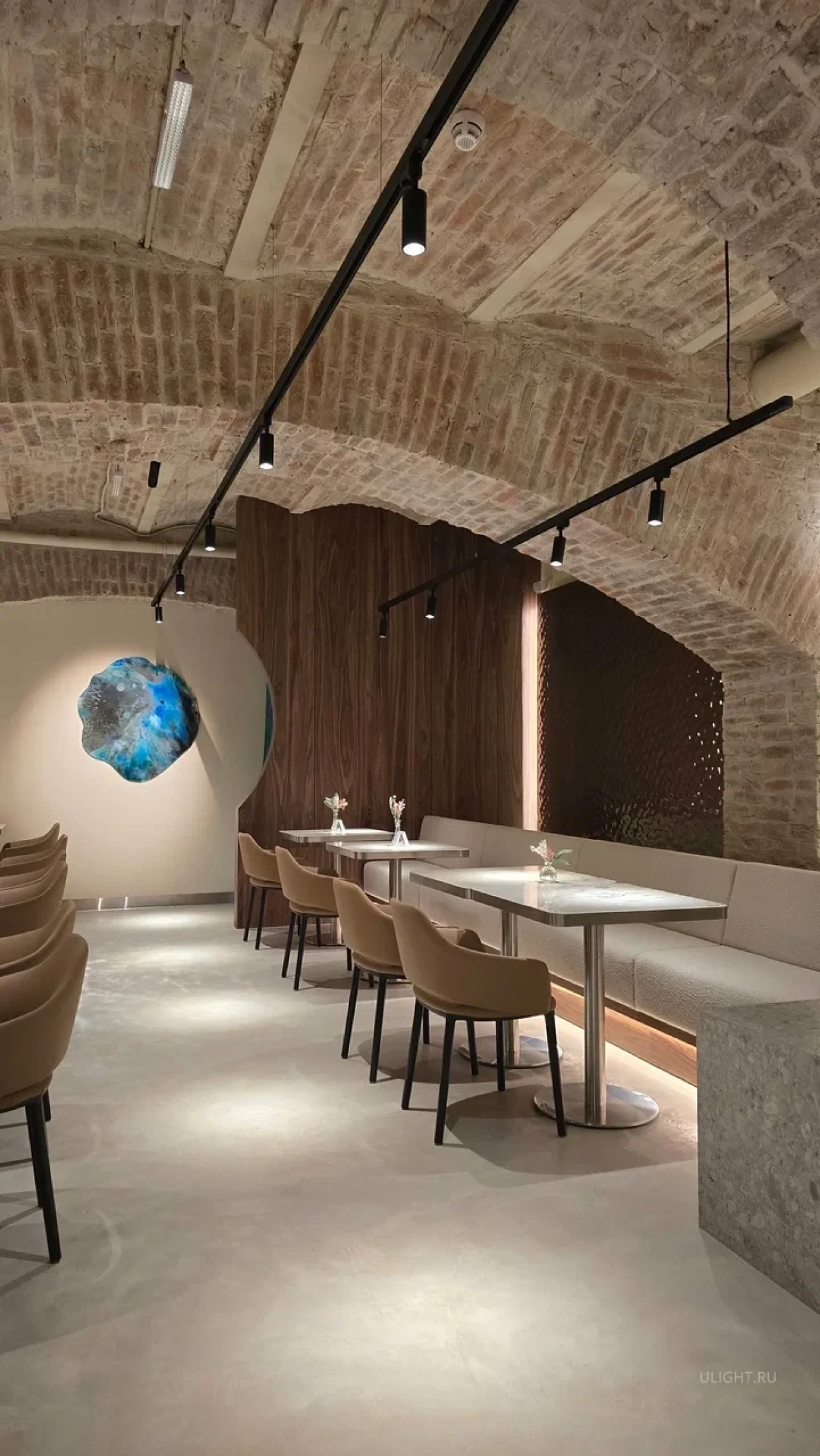 В основном зале применены трековые светильники с узкими углами рассеивания. Каждый прибор точно направлен на поверхность стола, формируя световые острова и визуально разделяя зал на приватные зоны. Такое решение создаёт эффект уюта даже при полной посадке и подчёркивает текстуру кирпичных арок.