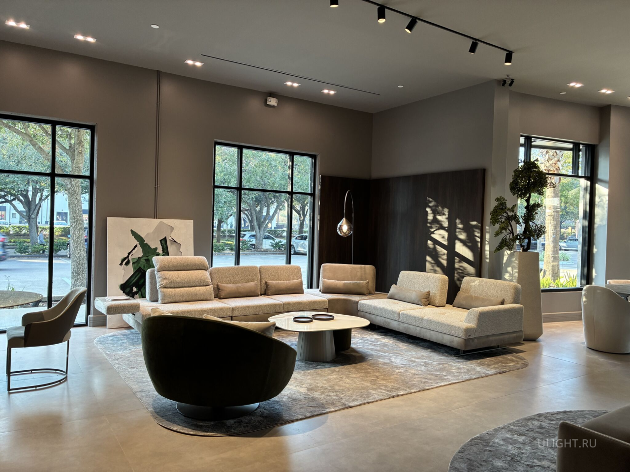 Решение построено на трековом освещении: оно позволяет гибко менять акценты под сезонные перестановки мебели, выделять ключевые зоны и сохранять ровный общий свет в зале. В результате интерьер выглядит дороже, материалы воспринимаются естественно, а детали мебели хорошо читаются с любого расстояния.