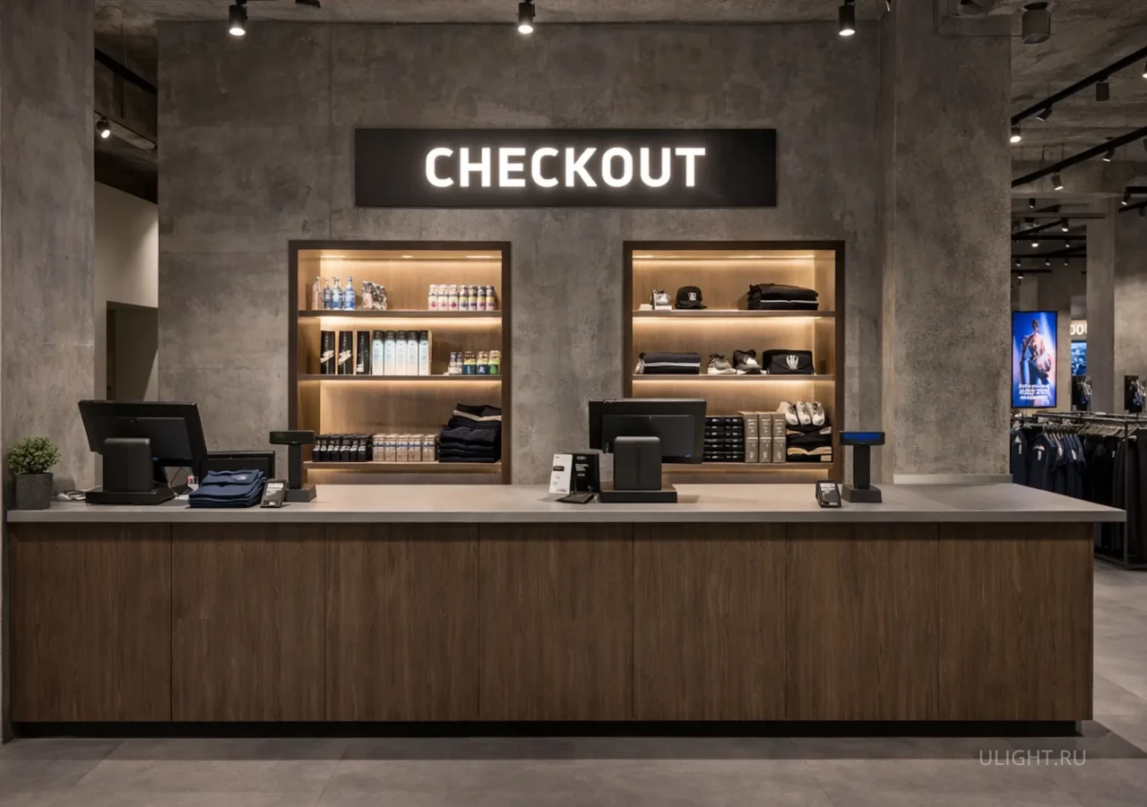 Касса выделена отдельной световой композицией. Акцентный свет подчёркивает стойку, обеспечивает комфорт для персонала и визуально фиксирует точку завершения маршрута покупателя.
