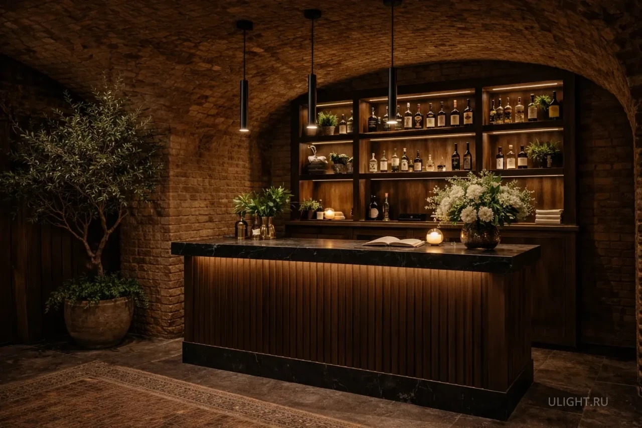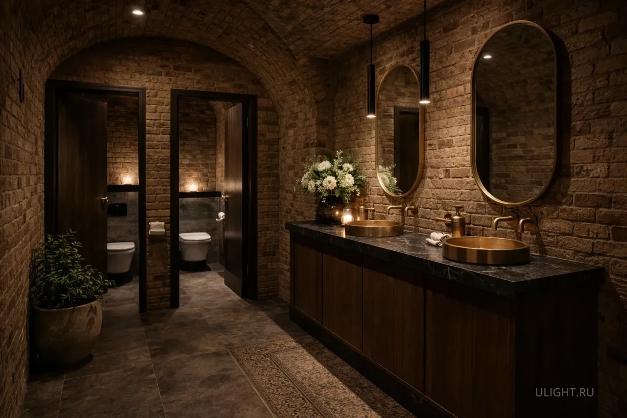 В уборной мы сохранили архитектурный характер подвала (кирпичный свод, фактурные стены) и добавили «премиальные» детали: тёплый свет, акцентные подвесы над зоной умывальников и мягкое заполнение пространства. Освещение подобрано так, чтобы лицо в зеркале выглядело естественно, а интерьер читался глубоким и дорогим.