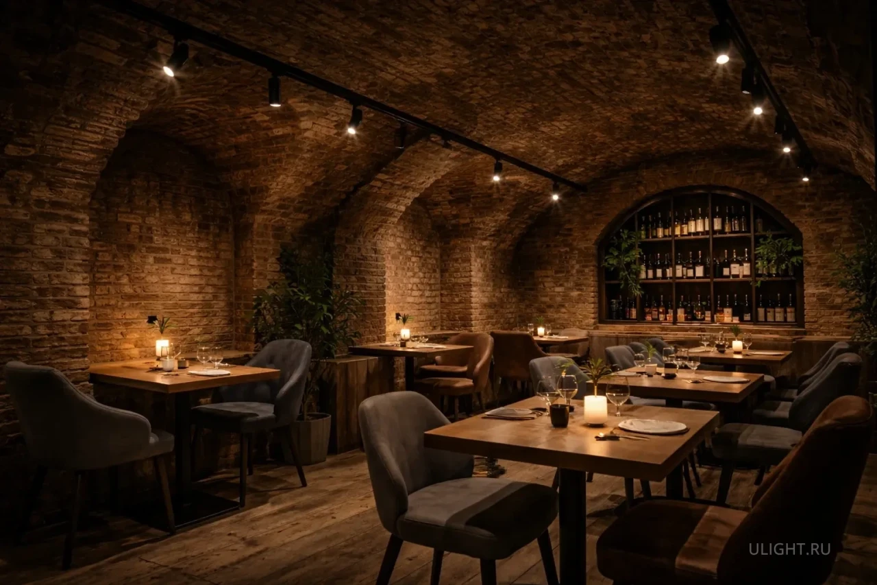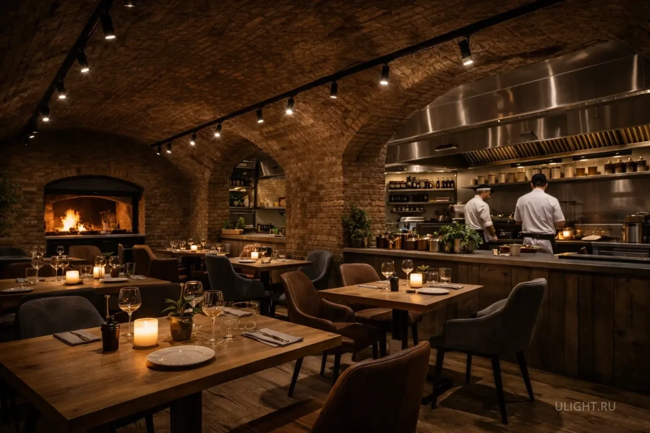 В большом зале применено трековое освещение с точными светораспределениями: светильники направлены на плоскости столов, а проходы и кирпичные своды остаются в деликатном полумраке. Открытая кухня с живым огнём дополнительно подчёркнута мягким контровым и рабочим светом: металл и фактуры выглядят «дорого», а пламя остаётся визуальным центром без пересветов.