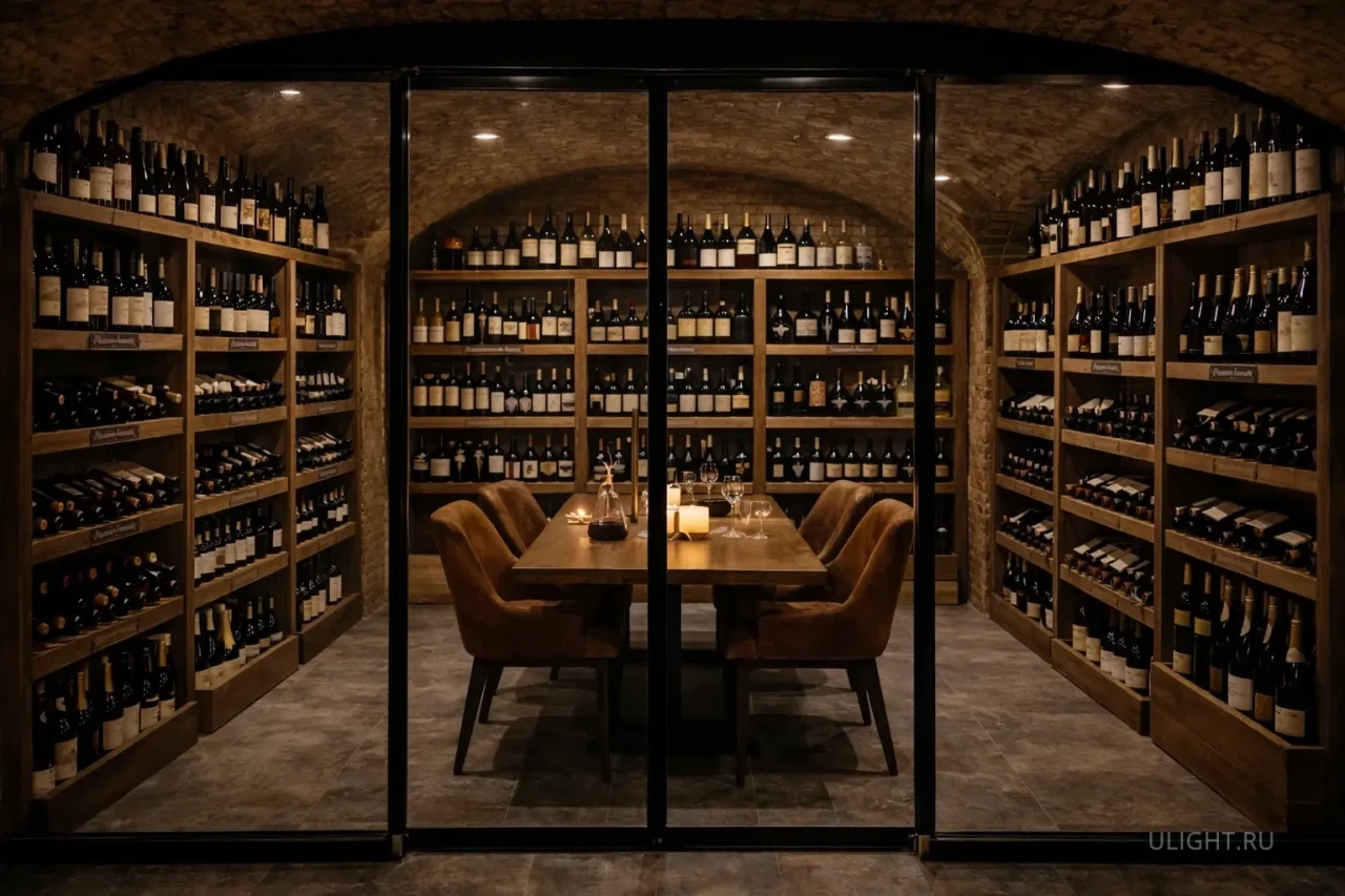 Винная комната выполнена как отдельный «объект-витрина» внутри ресторана: остекление в чёрном металлическом профиле и тёплые акценты внутри. Мы сознательно ушли от ощущения склада — количество бутылок визуально контролируется, а свет распределён так, чтобы полки выглядели премиально и глубоко.